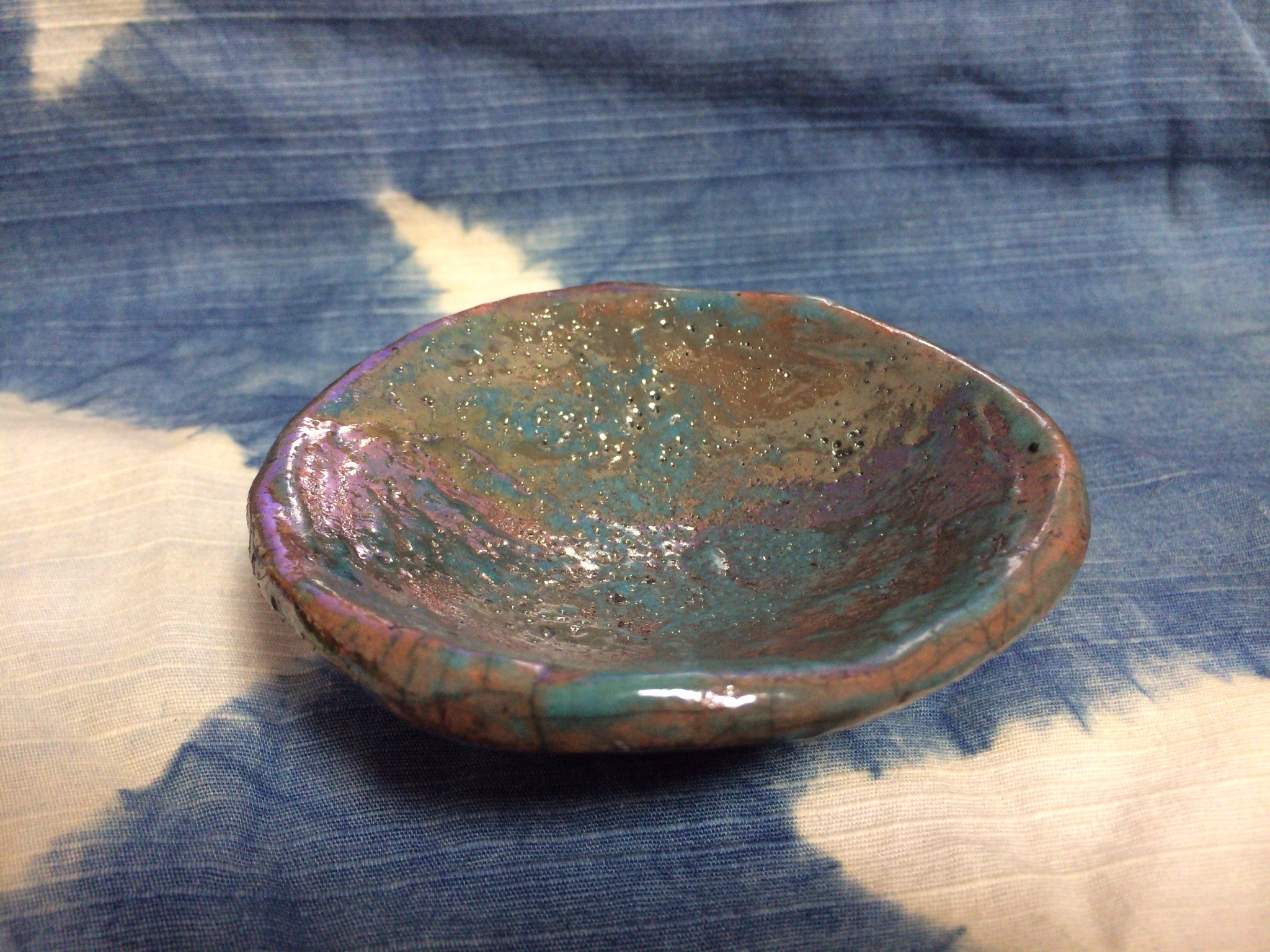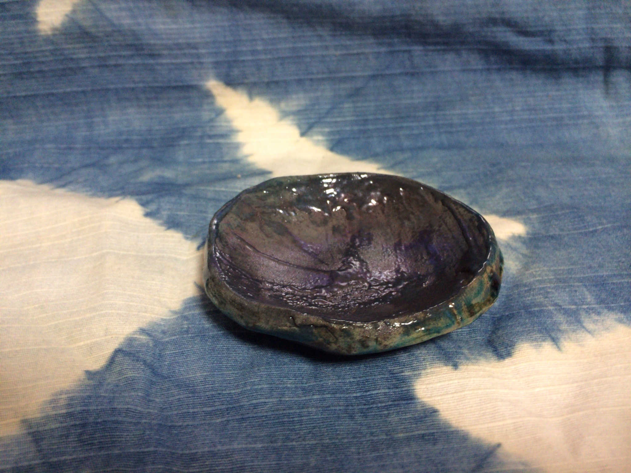これが見事な金属光沢の器となりました。器3つに塗ったのですが、それぞれが違う顔となりまして、個人的には派手過ぎているように見えますが、これはこれで有り。不思議な色合いで見ていて飽きず、変わり塗りに通じるような色で面白い。次もこれを発展させてみよう。