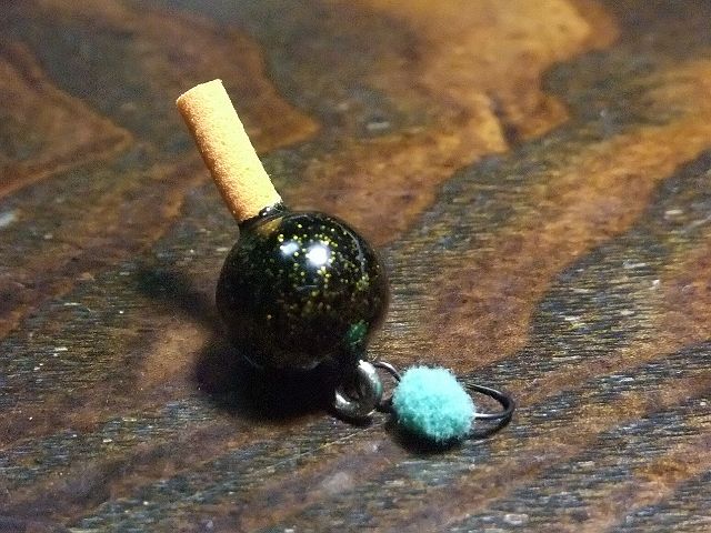 丸いウッドボディにEVAを円柱状に削ったものを取り付け、フックはウーリーマイクロエッグ付き。