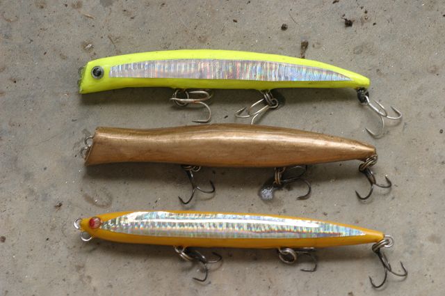今回は新しいルアー持っていきました。今週の水曜日くらいからスタートしたもので、まだまだ未完成状態。コーティング半乾きで指紋も着くくらいベタベタですが、無理やりフック付けて強制デビュー。ちなみに2つ。写真真ん中はコーティング無しで色(カシュー系塗料の金)を塗っただけ。(一番下は前回釣行で実績を残せた自作ルアー)