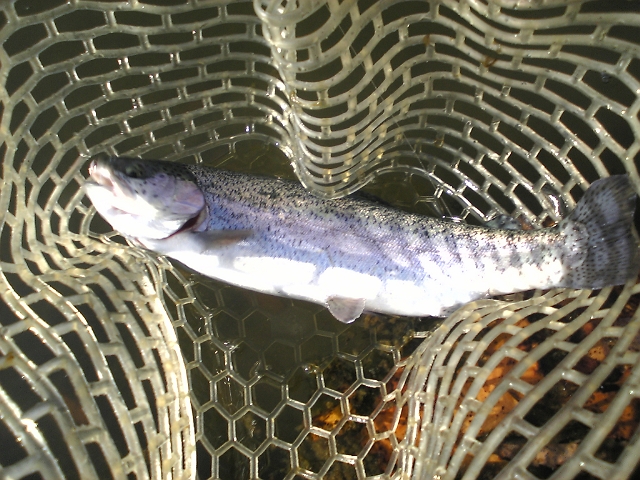 最初のフライはちょっと大きめのマラブーを投げていましたが、黒→オリーブ→茶→チャートと駄目で、白でヒット。ここまで30分超。釣れてきたのは体高のある大きなニジマスでした。驚いたのはこれがアベレージくらい。王禅寺のニジマスはけっこうデカイ(もしかしてセカンドポンドだけ?)