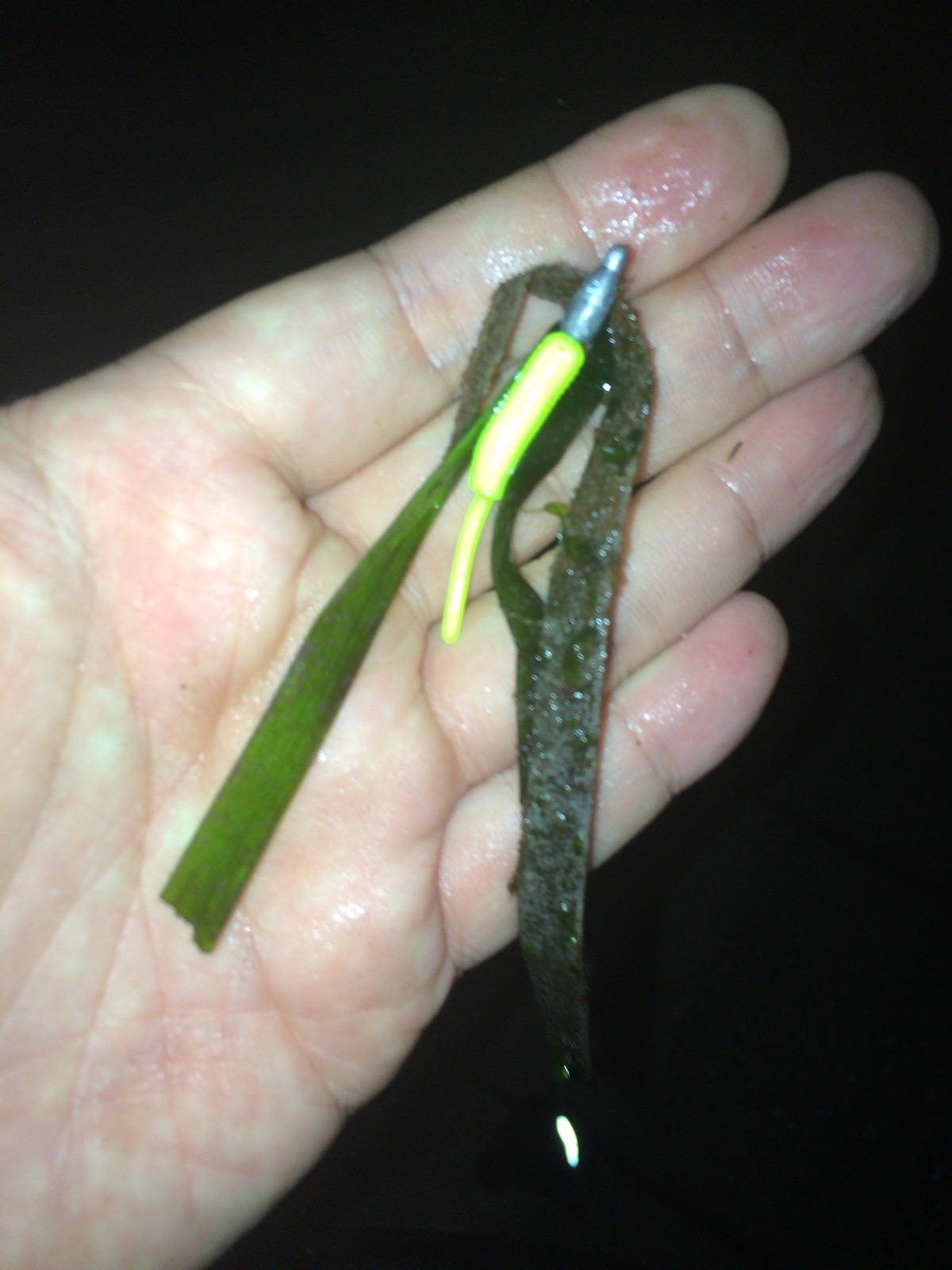 で、とりあえずアマモの群生を避けて、アマモの際を狙って歩いてみる。暗すぎて見えないからアマモ狩りにならない場所を狙ってみると、、、やはり釣れてくれました。