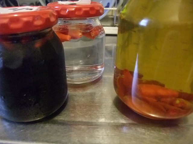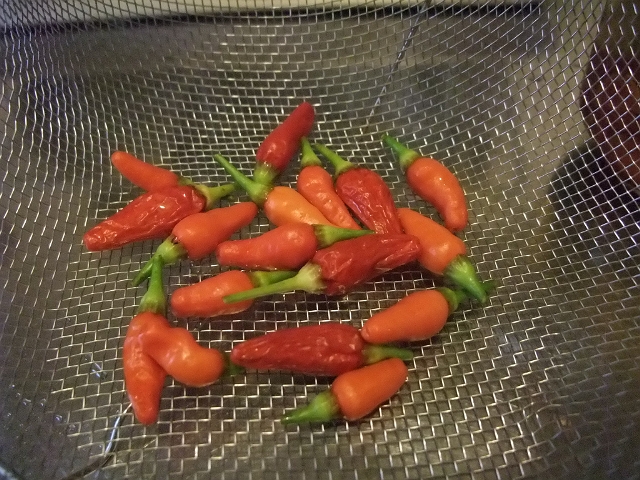 というわけで、とりあえずお試しとして10粒づつくらいを醤油漬けとウオッカ漬けとオリーブオイル漬けにしてみました。残りは天日に干してカラカラにして、一味唐辛子(本当なら鷹の爪)にしてみようかと思ってます。