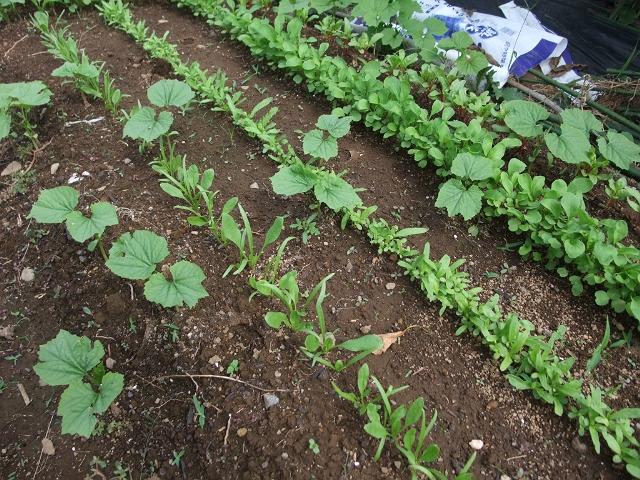 スジ蒔きしたところを完全無視してボコボコと出てる。私が蒔いたときのコボレ種って感じじゃない。見たところウリ科だな~、と思ったところでピンとキタ。
