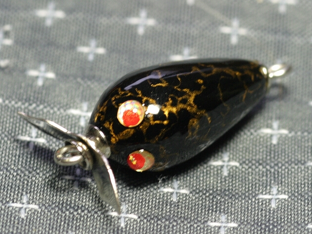 オーソドックスに黒金で仕上げています。プロペラの銀色が映えます。FF川越のトップで意外と良いかも?なんて思ってます。野池のギル釣りにも良さそうな感じ。