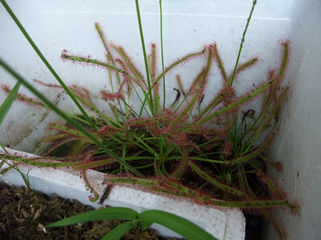 今年もサギソウを浮箱式でやっているので、そこの横で育てているのですが思いのほか生育が良くて、元気に繁茂しています。グロテスクなんですけど、この赤い鞭毛が綺麗なんですよね。モウセンゴケでも浮箱式があっているようです。