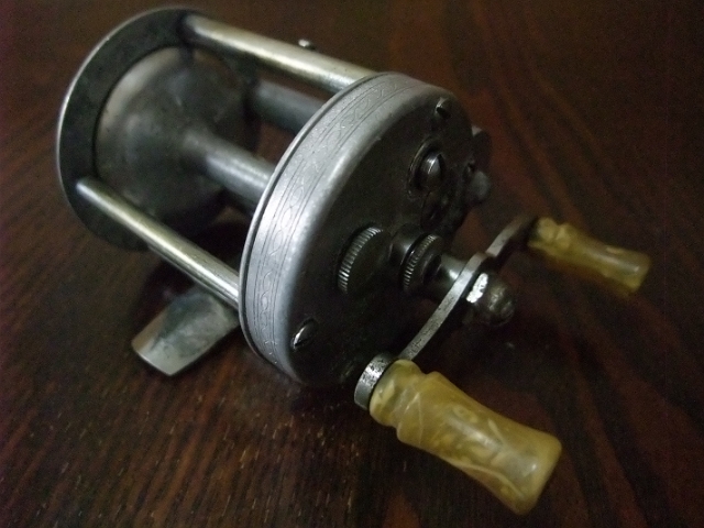 ダイレクトリールとは、一般的なベイトリールと異なり、クラッチがなくてハンドルを回すとスプールも同時にまわるリール。逆回転もできる。どーいうレベルのものなのかよくわからないし、年式もよくわからないです。見た目で判断すると、けっこう古そう。もしかすると私よりも年上?