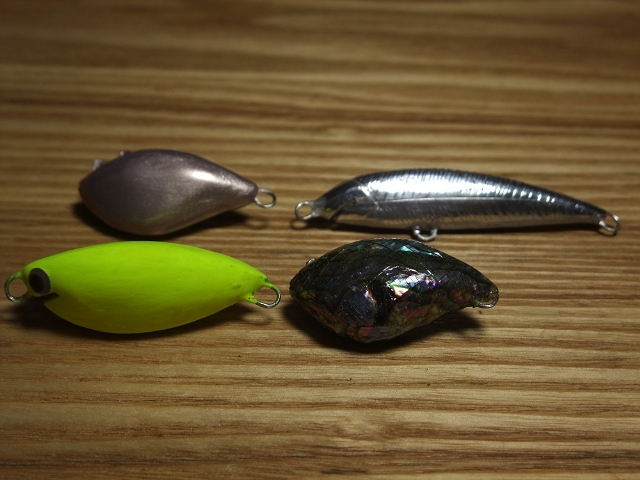 右下は「あわびシール」を貼ったもの。中古釣具屋で100円で売っていました。写真ではわかりにくいですがウグイの婚姻色のような色合い。魚は釣れなくても人間は釣れそうかも?