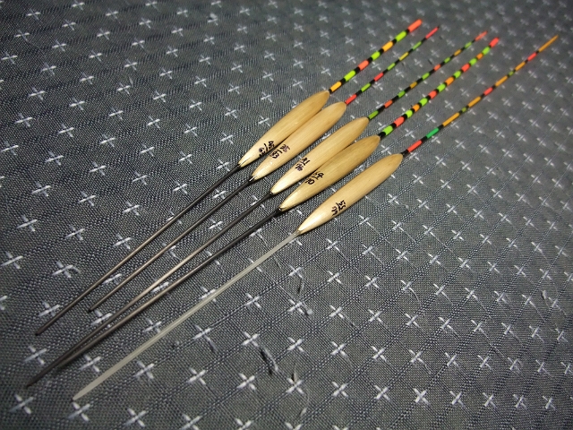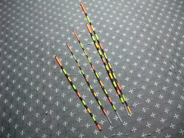 ウキはほぼ同じサイズで、トップと足だけ変えたもの。ボディは全く同じに作りたかったけど、私の技術ではまだまだ困難。出来栄えも綺麗ではないけれど、とりあえず使ってみたいと作ってみました。
