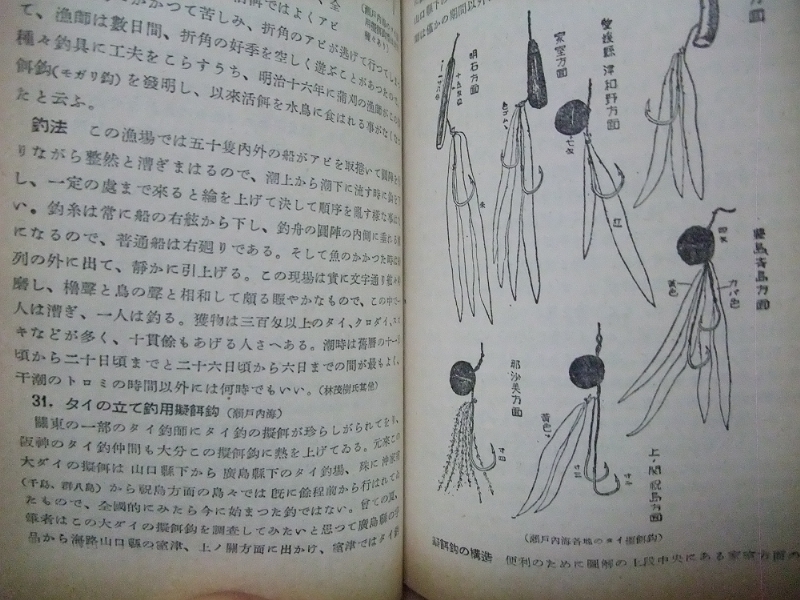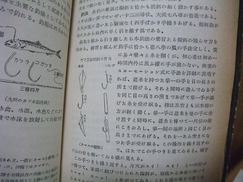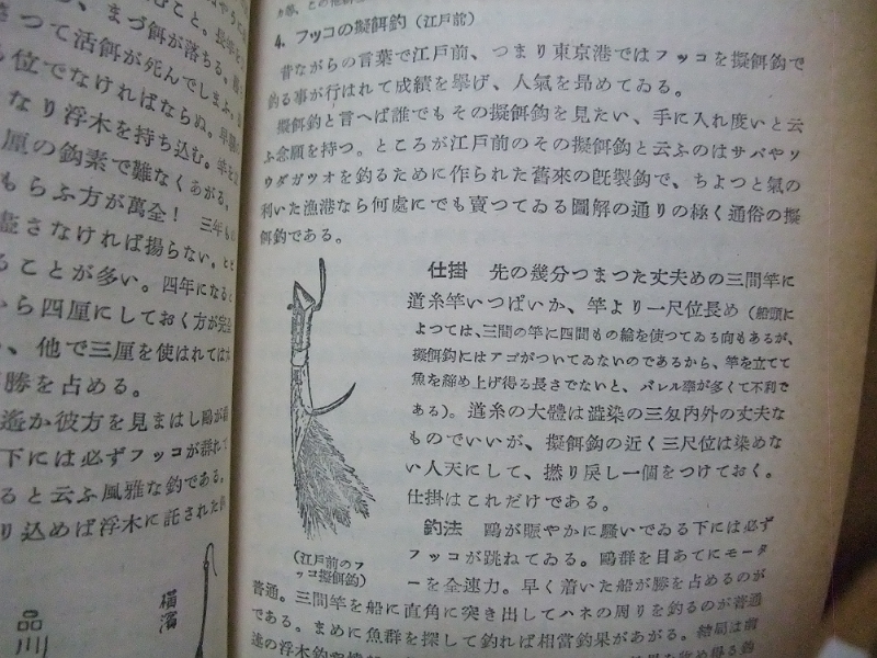 当時は場所によって釣り方が異なっていたようで、例えばスズキ釣りであれば江戸前、品川沖、横浜港、湘南、外房沿岸、常磐久慈浜、神通川(富山)、瀬戸内海、銚子、浜名湖と驚くほどの多彩な釣り方が書かれていました。伝統漁法から趣味の釣りへの転換された名残なのでしょうね。ネットのある現代と違って取材時の御苦労は大変だったと思います。