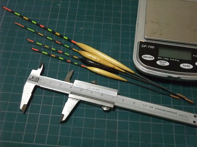 というわけで、基本が大事だろうと自分で作ったウキとわずかに持っている市販品の寸法と自重、オモリ負荷を測っています。仕事みたいでちょっと微妙な気分になりますが、まずは黙々と測定しております。