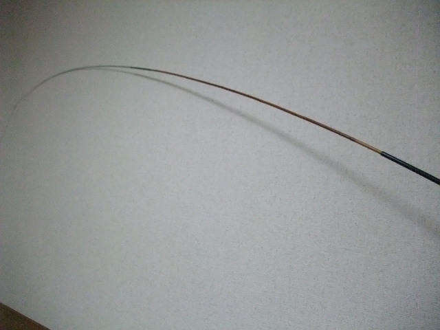 肝心のベンディングカーブですが、1人で写真を撮るのは難しかったのですがこんな感じ。ちょっと先端側にイビツなラインがありますが、カーボン部分ですし先調子の範疇に入るかな~というところ。ただもっと負荷を掛けた場合に継部に負担が掛かる可能性もありますねぇ。1回使ってみて問題あるようならば、また考えてみるつもりです。