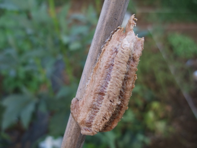 先週、根を引き抜いておいたゴーヤなどを片付けていたところ、またしてもカマキリ殿の卵を発見!!去年に引き続き、今年もゴーヤの影に生んでいたみたい。今回は竹の支柱に生んだようです。この支柱だけは片付けずに立てておきます。来年の春は私はこの畑にはいないけど、子どもたちが畑を守ってくれることでしょう。