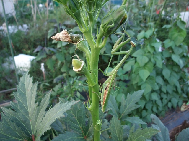 オクラの上で巡回中でした。お腹が大きかったので、卵を産む場所を探しているのかもしれませんが、なるべく植物のところには生まないほうが良いですよ。いまはオクラは元気ですが、そのうち枯れちゃいます。卵を見つけたら、安全なところに移動するつもりです。それにしてもカマキリはカッコ良いなぁ。