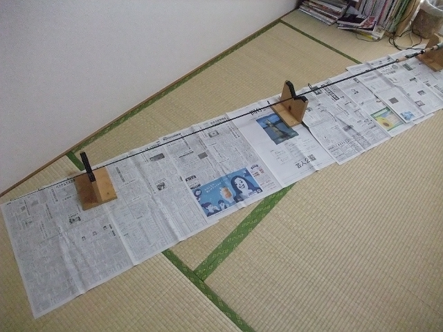 私の作業部屋では部屋が狭くてコーティングするスペースがないため寝室に使っている和室でコーティングしてます。フレックスコートでのコーティングで冬場はマル1日硬化まで見てますが、今日やってみたところ8時間くらいでカチカチになってました。暑いですからねぇ。そーいえば夏場にロッドビルドするのは初めてかもしれません。
