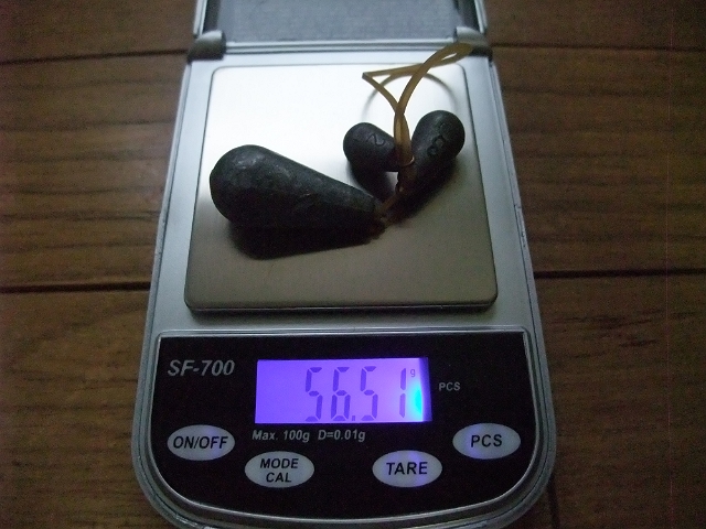 で、とりあえずナスオモリを使ってみたところ6号+2号+1号でバランスが取れました。リールシートの真上に支点が来ています。これを目安にしてグリップエンドを作っていきます。ちなみにナスオモリ3つの重さは56.5g。