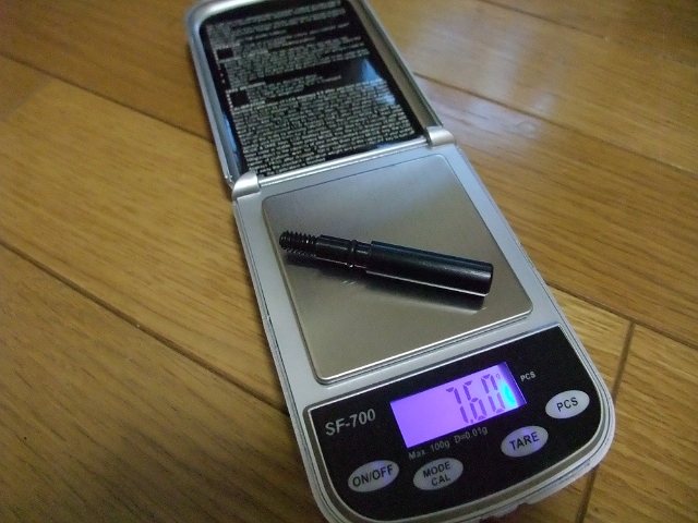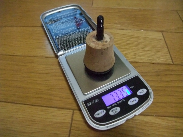 グリップエンドはジャストエースのものを使い、オモリを仕込んでネジを取り付けたのがコレ。ネジ部が7.6g、で完成グリップエンドが73.3g。差し引き65.7gとなって、さきほどのバランスよりもちょっと重めに作れました。