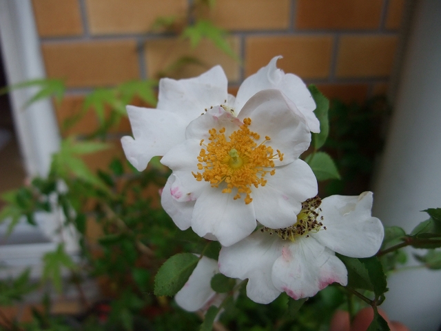 以前、多摩川の河川敷のノイバラの枝を少々拝借してベランダで挿し芽をしていたものが1年半越しで開花しました。
