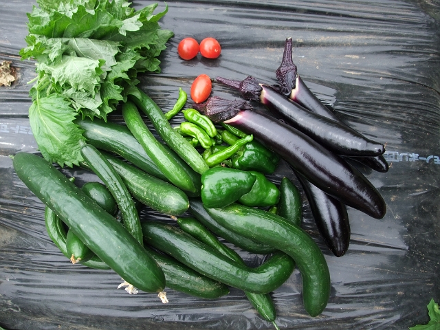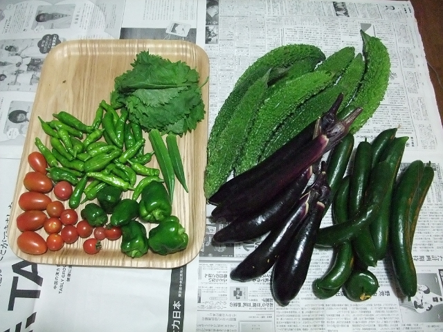 嫁さんが木曜日に収穫に行ってきたのですが、本日(土曜日)に収穫したものがコレ。キュウリは全盛期。ナスもだんだんと収量が増えて、シシトウは小さいけどたくさん。あとはミニトマトとピーマンとシソの葉。