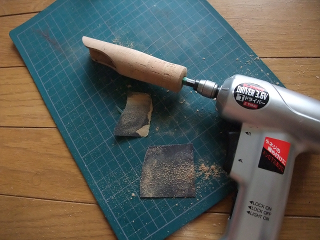 最初は電動ネジマワシにコルクを取り付けて簡易的に削りだしたあと、手削りで気に入った形状にしてみました。