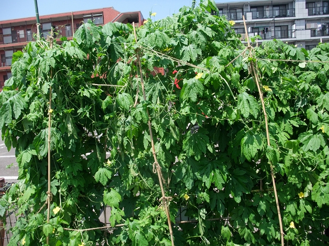 今回作っている品種は、GWに長野に帰省したときに買った『沖縄長れいし』。1株80円。失敗したら嫌なので2株植えたのですけど、いまのところ両方とも絡みに絡み合って、どこがどーなってるのか分からないぐらいに伸びていて、現時点では大成功といったところ。