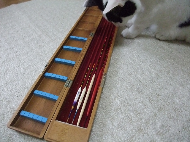 右側が今回改造したハリス箱。マジックで印を付けてあるところが5センチ毎の長さの区切りです。ちなみに左側はウキ箱で、左側から3本は私が作ったウキ。右側2本はエスさんからいただいたウキです。