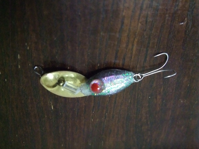 そーいえば、管釣りでラインのヨレナイスピナーでかっしーさんが爆釣してたなぁと思って、今回のテイルスピンを作るついでに作ってみました。こちらはオモリは1号。針金を曲げて芯をズラしてヨレナイ工夫としてみました。管釣りには早すぎますが、テクトロでセイゴを狙ってみます。
