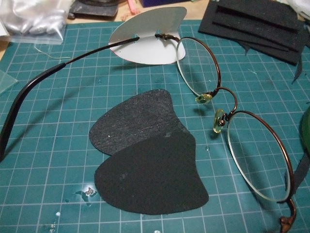 型紙(と言っても広告の裏紙)を使って、イメージのものを眼鏡に合わせて作ってみて、黒の皮革のハギレをハサミで切り出し。