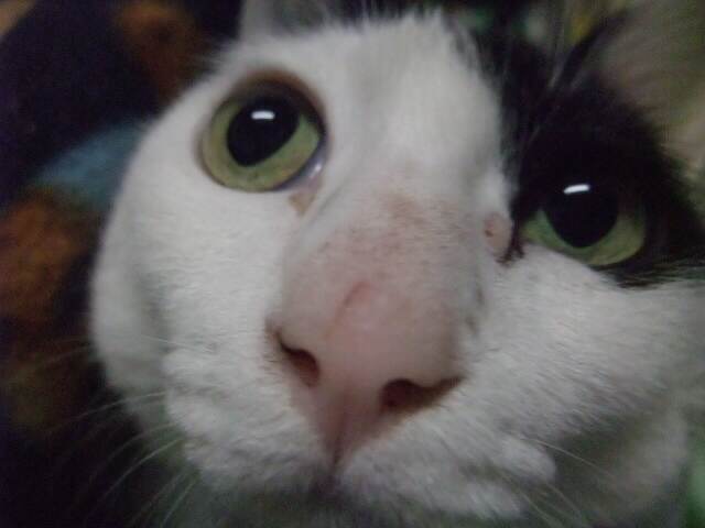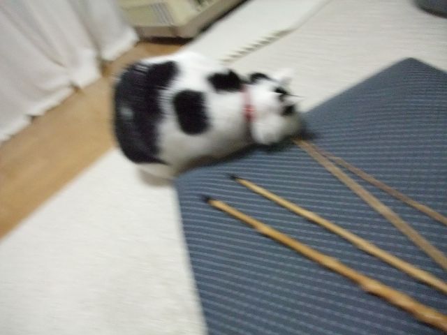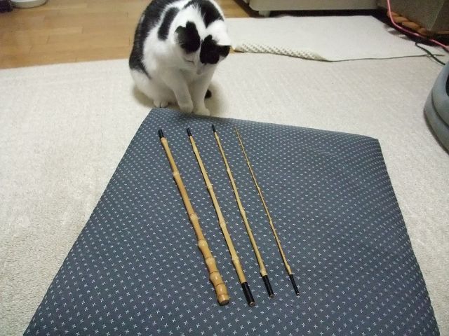 4本に切断し、竹の表面をクリーニングしてから黒スレッドで口巻きをした後、いつものようにタマに協力してもらって写真を撮ろうとしたら。。。ちょっと機嫌が悪かったようでしたが、なんとか大丈夫でした。かなり危なかった。