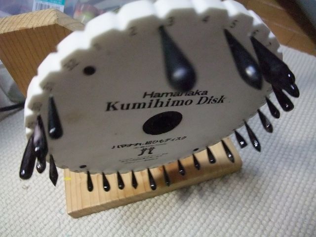 最近は作ってませんけど、以前作った組ひもの赤黒(柄の名前は忘れました)。やってみると意外と簡単。ロッドビルドの飾り巻きと同じようなものです。組ひもを編んでいくのも無心になれて、けっこう楽しい作業でした。