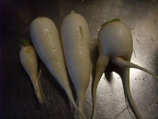 ミニ大根はスティックにしていただきました。一番右側のものは耕しが甘かったのか見事に3股大根になってしまいました。