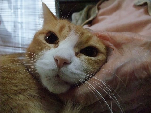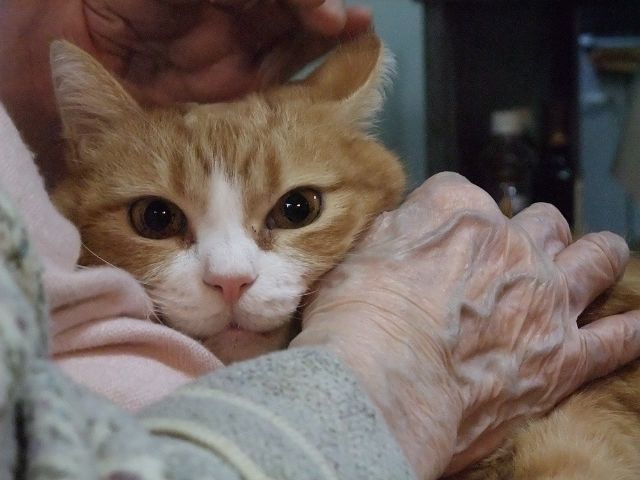 で、チャイコはビビリ屋なのですが、なぜかばあちゃんのひざの上では大人しいし、落ち着いている感じ。なかなか自宅では見ないリラックスしてそうな顔。ばあちゃんからでている蓄積されたオーラの影響か?写真は93歳の手に抱かれる推定9歳。ばあちゃんの手はカッコ良い。