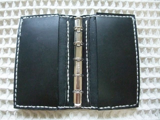 今回は使用したものはシステム手帳の中では一番小さなミニ5穴。金具はハンズで購入。革はユザワヤで買った牛皮のハギレ。革の色は黒や茶か迷いましたが黒。革を止める糸は白にしました。