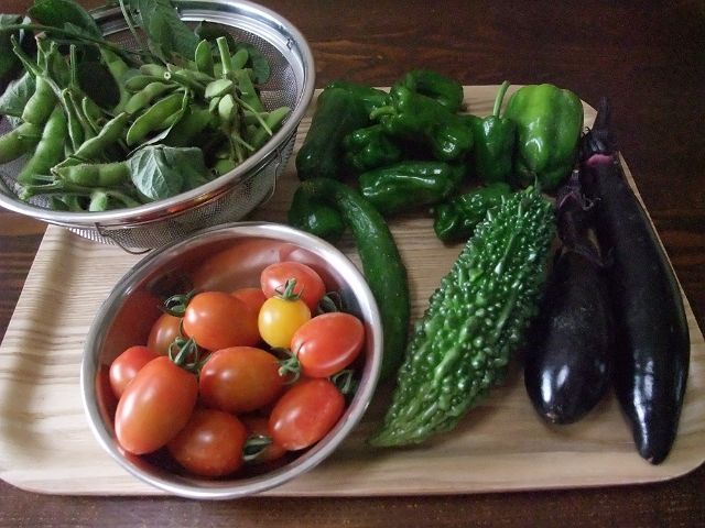 本日の収穫物は収量が多くなってきたミニトマト・ナス・ピーマン。それに初収穫のゴーヤ。そして本日のお題のエダマメを収穫しました。エダマメは我が家の畑の中でも、若干元気がなかったのですが、ここにきて持ち直してきてマメも大きくなってきてくれました。苗を植えてからおよそ2ヶ月での収穫です。