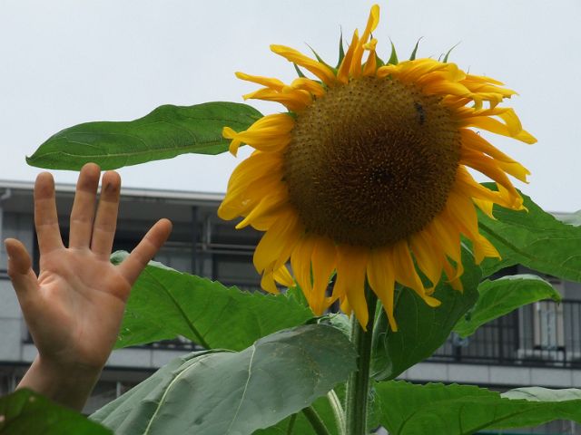 このひまわりは我が家の畑の植物の中で一番立派。幹の太さは約3センチ。高さは2mほど。葉っぱの大きさもかなりの大きさ。花の大きさは手のひら以上です。いまでは我が家の畑のシンボルプラントになっています。