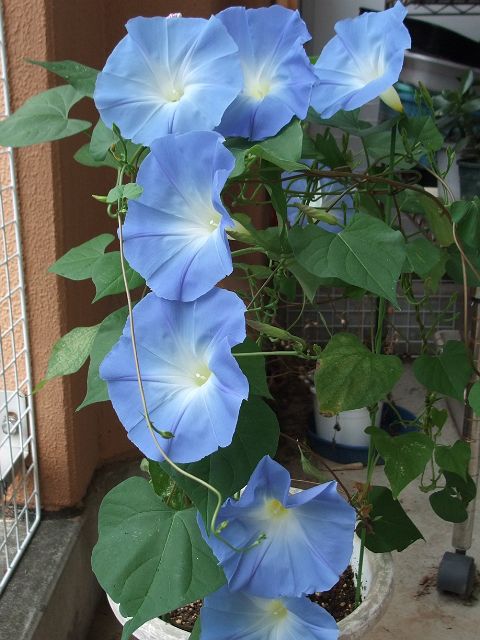 土曜日に初花が1つ。今朝は7つ咲いていました。朝顔の種類はアーリーヘブンリーブルー。普通のヘブンリーブルーよりもちょっと早めに咲きます。綺麗な青空のようなブルーでこの色はとても好きなのです。