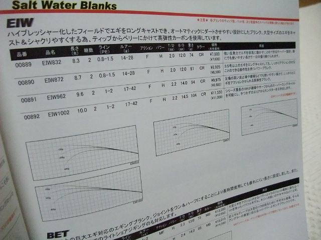 ひとつはジャストエースのカタログですが、個人的にはブランク重量と調子が載っているのが素晴らしい。ロッドを作るうえでの妄想が高まります。是非、マタギさんも調子は無理にしても(?)、ブランク重量くらいは載せてもらいたいものですね。