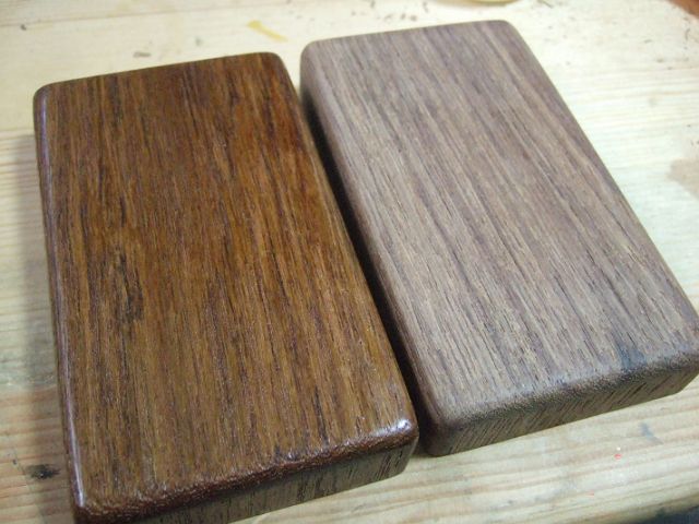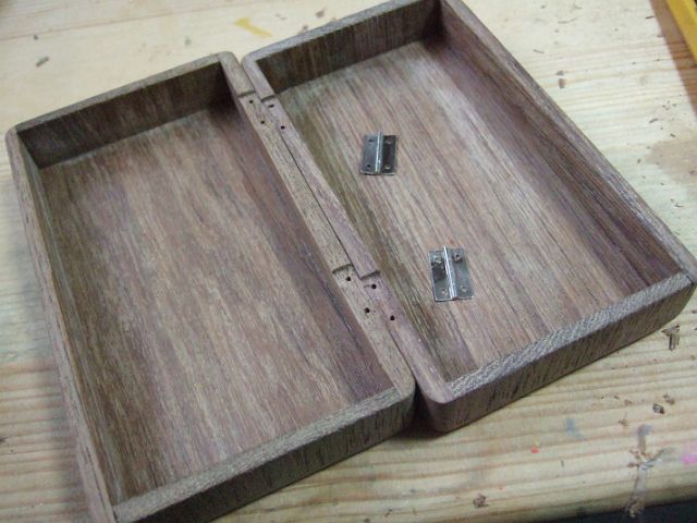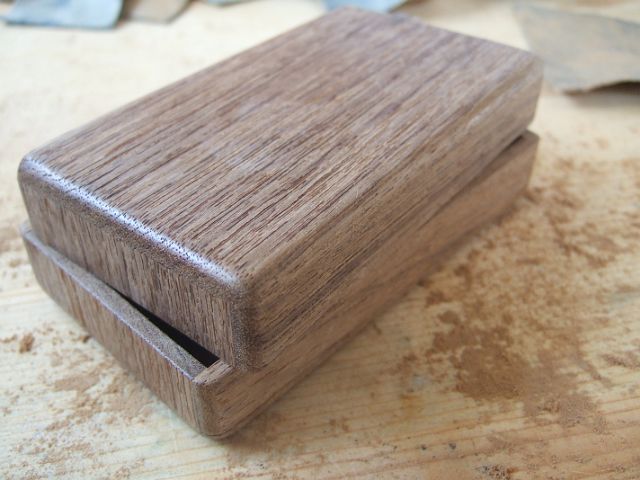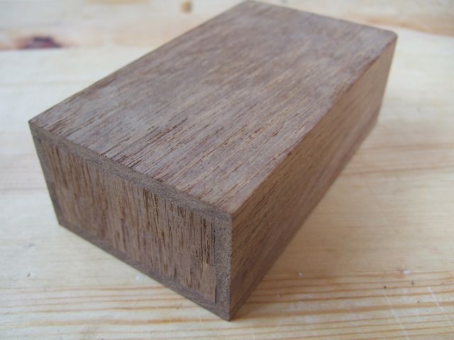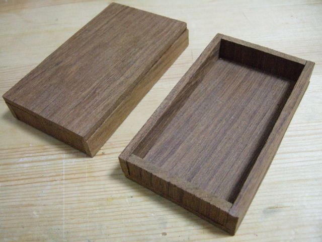 私の場合は、銘木から箱型に削り出す・・・なんてことは削りだす道具もないので、ハンズに置いてある木のハガキを2枚使って作りました。あれはなかなか使い勝手が良いのです。