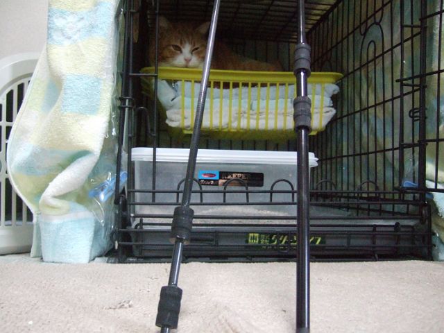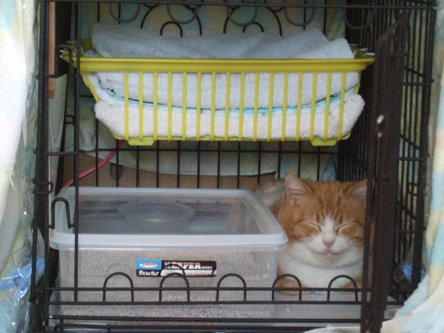 ちなみに、私の作業中に横のゲージにいた居候猫は大人しくしていました。暖かかったせいかゲージの布団の上じゃなくて、下でずーっと寝ていました。ゆっくり休んで早く直してください。