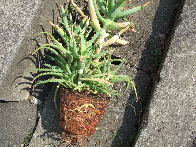 嫁さんが長野の実家から連れてきたアロエなので確か3年は植え替えをしていないハズ・・・ということで、上の部分も子株が出てきてワサワサになっており、根も鉢いっぱいに張っていて、見た目ちょっとグロいです。
