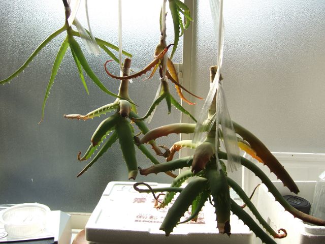 小さな株もほとんど取り外して風通しをよくしました。伐採したものは1週間ほど干してから挿し芽にする予定。うまくいくかはわかりませんけどね。いまあるものも、とりあえずは2つの鉢を分けました。植え替えが失敗してなければ、元気になると思います。でも、全部元気になってアロエだけで3つに増えたらどーしましょう。。。
