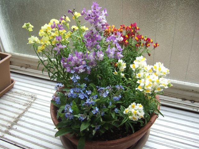嫁さんが一目惚れした春らしい色合いの4種類のリナリア(姫金魚草)と忘れな草の寄せ植えです。こちらはとりあえずは上手く行ったかも。花芽が付いているので、しばらく楽しめると思います。