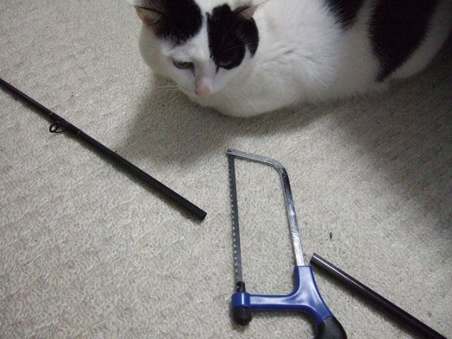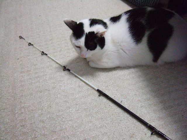 エイヤ!!と先側ロッドを切断して端面やすりがけ。そろそろと元竿側に入れてみたところ、驚くほどにピッタリ!!振ってみてもギシギシ音もせず、竿の曲がり具合も不自然無し。問題があればガイドを外してセッティングしなおそうかと思っていましたが大丈夫みたい。旧式な竿なので重たいですが、かなり丈夫そう。良さそうな感じです。